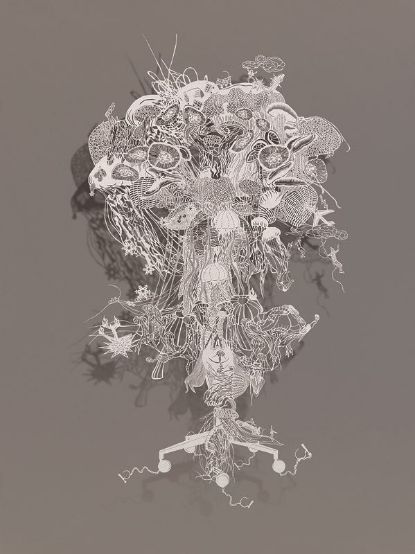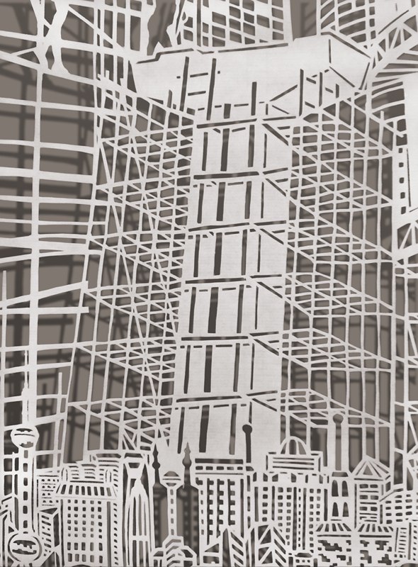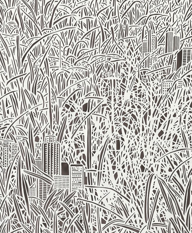 Bovey Lee Hong Kongban született, jelenleg Amerikában él, és elképesztő aprólékos munkával vág ki rizspapírból különféle darabokat, hogy a végén csipke-részletességű képeket kapjon. (Mellesleg festő és kalligráfus is.) Munkái közt vannak geometrikus formák, régi kínai motívumok, városképek, absztrakciók – és mindezeknek a keveréke.