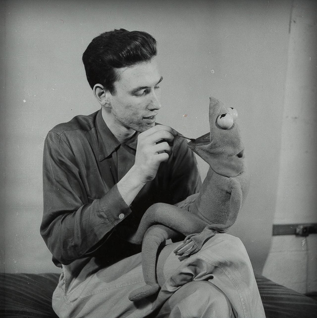 Jim Henson nem DNS mintát vesz Brekitől, hanem úgy csinál ezen a beállított képen, mintha éppen az utolsó simításokat végezné rajta. Az első Breki bábu az 50-es évekből.