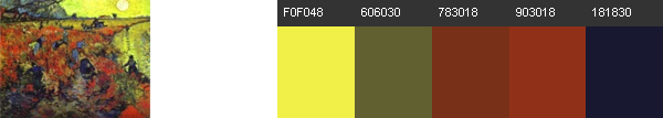 Kicsit specifikusabban, festőkre lebontva is izgalmas a dolog. Az Art Varsity 35 híres festmény színpalettáját mutatja be cikkében, ezek közül néhány ismertebbet válogattunk. (Jó játék egyébként a képeket kitakarva, csak a színekből megtippelni, hogy vajon milyen lehet a festmény hangulata. Csak egy ötlet.)